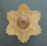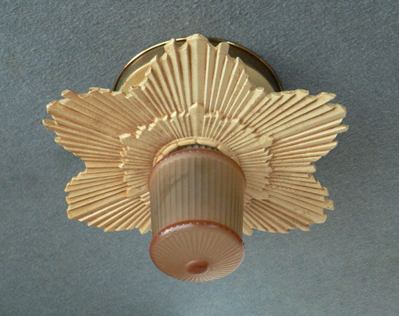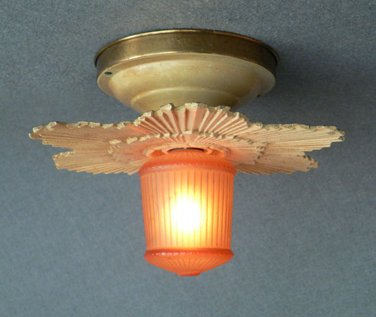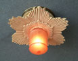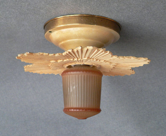 Chandelier C233*Not Available* This lovely Art Deco flush mount Chandelier was made in the 1920's. The classic Deco sunbust of the metal fixture surrounds the special, cylindrical, amber glass bulb in the center. This design, with its unique, decorative bulb is quite ingenious. The patina on the metal fixture is a yellowish-cream color. Length: 7" (flush mount) |
