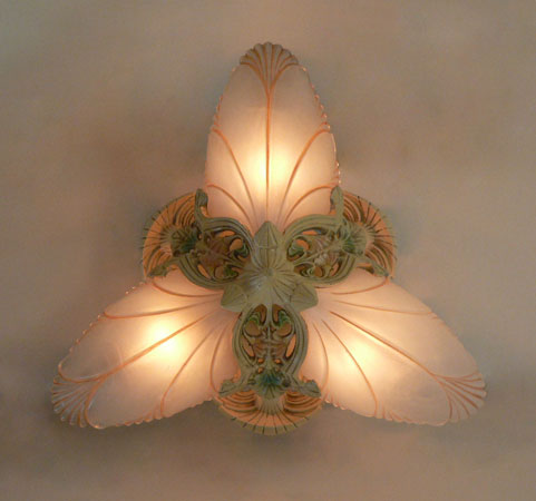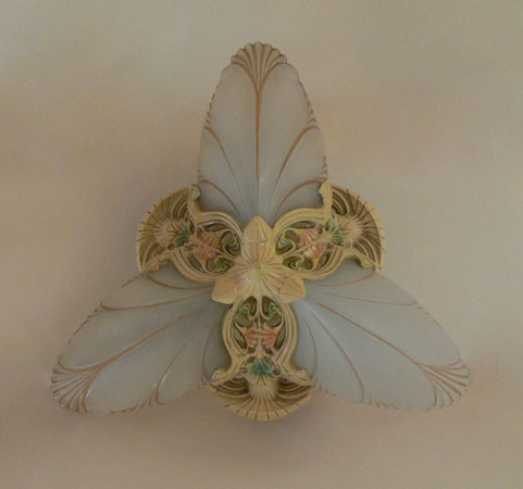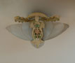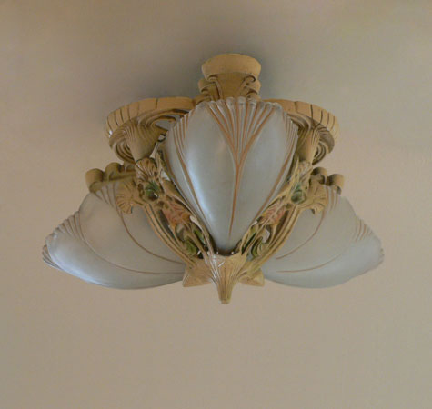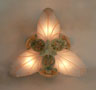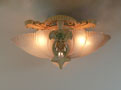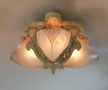 Chandelier C234This flush mount Art Deco chandelier was made by the Midwest Manufacturing Co. It has three off-white, glass, "batwing" slip shades with painted organge decorations. The fixture has the original cream colored patina with pink and green accents. Both the glass shades and patina are in very good condition. H: 7"(fixed mount) |