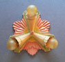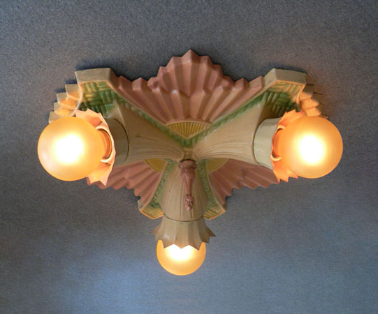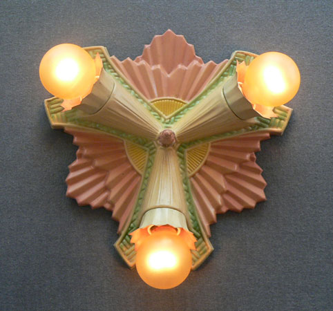 Chandelier C240*Not Available* This Art Deco design, formed in a classic starburst, was made by the Gill Glass and Fixture Company. It still has the rare decorative "cuffs" that fit around the bases of the lightbulbs. The patina is multi-colored with cream, pink, and green. (please note: the bulbs are not included) Length: " (flush mount) |