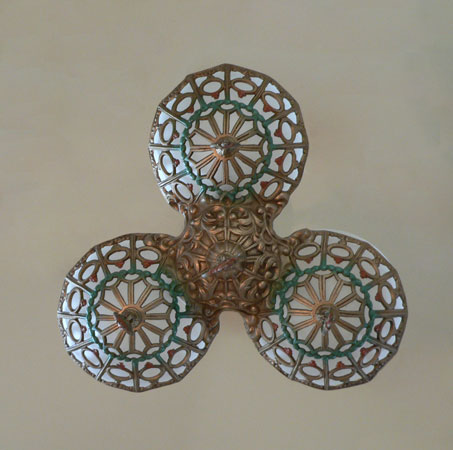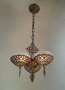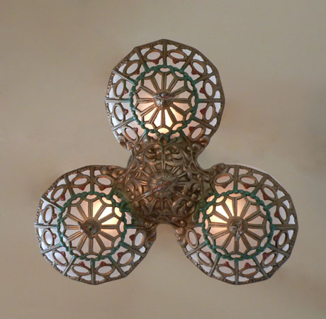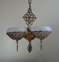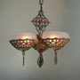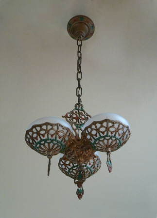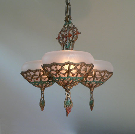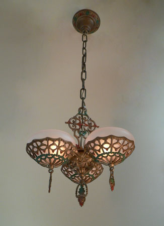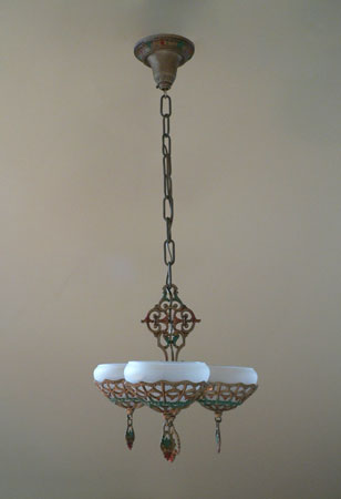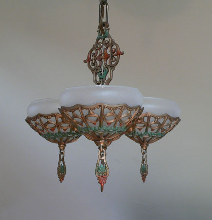 Chandelier C242This beautiful Art Deco chandelier was made by the Gill Glass company. This example of their elegant "Du Barry" has three frosted glass globes, each held in a delicate metalic basket. The patina on the metal is a dark golden color with brick red and green accents. The fixture has been re-wired and is ready for installation. Length: " (adjustable chain) |
