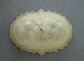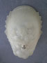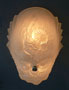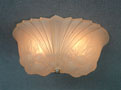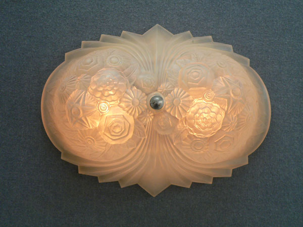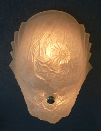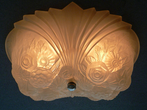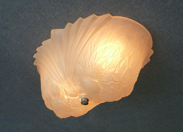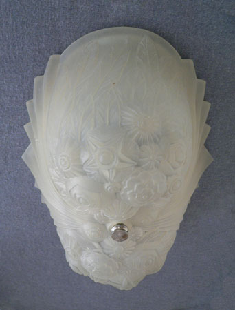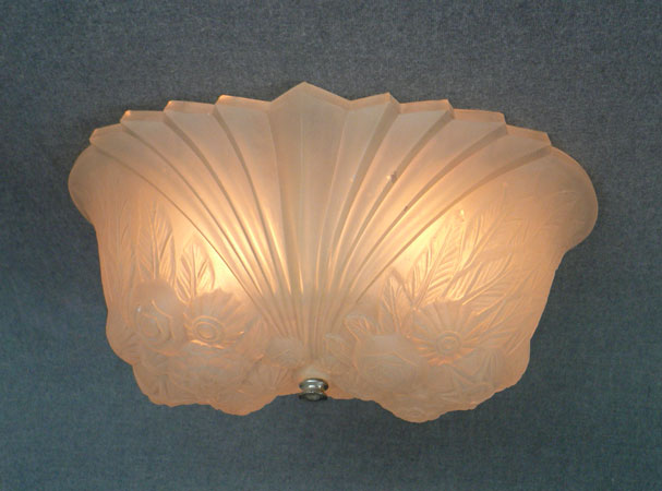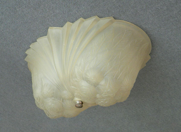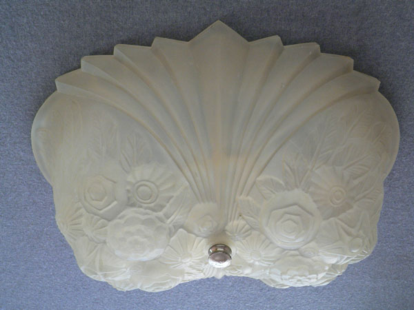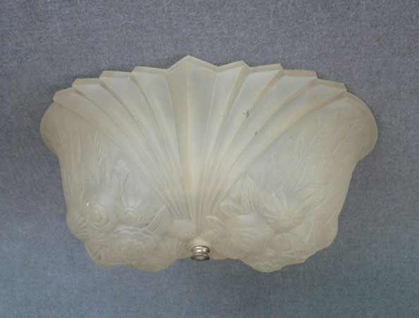 Chandelier C243This wonderful Art Deco chandelier was made by the Consolidated Glass Company. The exqusite, frosted white, glass shade has classic floral and fan patterns sculpted in deep relief. The glass shade is held directly against the ceiling, with no hardware showing. The glass is in very good condition. Dimensions: 11.5" x 8" |