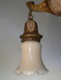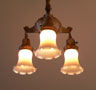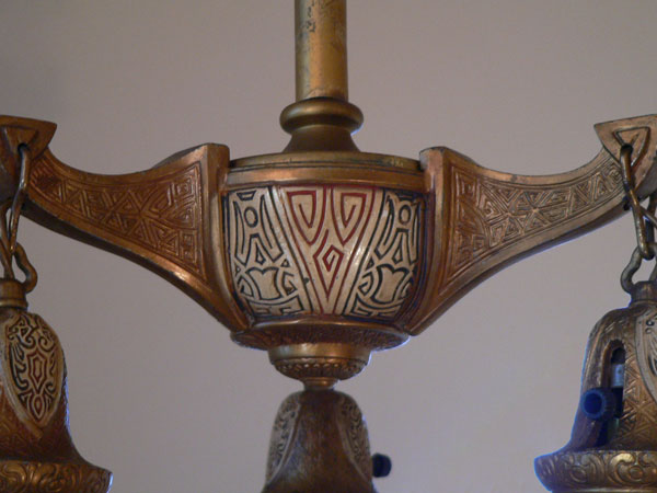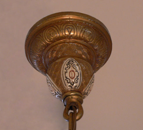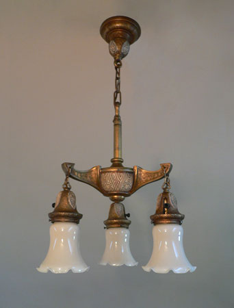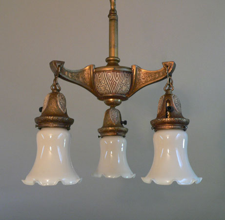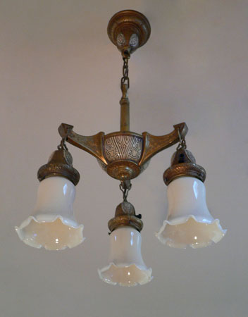 Chandelier C244*Not Available* This elegant antique chandelier has three cream colored glass shades, that are graceful in form, with wonderful fluted edges. The dark brass colored fixture is incised with intricate geometric designs, with some areas colored with cream, red, and black. It seems to be a transitional piece between Victorian and Art Deco considering the treatment of the metal. Both the fixture and shades are in very good condition. H: 30" (adjustable chain) |