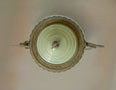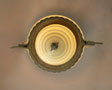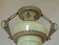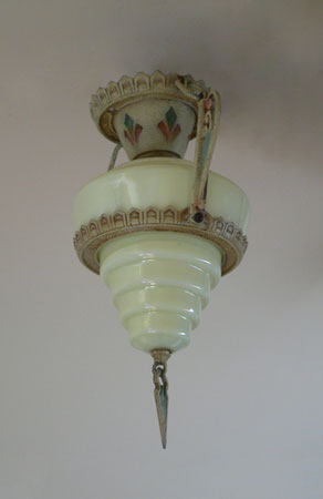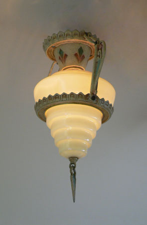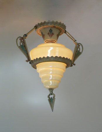 Chandelier C249This lovely antique fixture is from the "Modernique" line by the Gill Glass & Fixture Co. The beautiful, five tiered glass shade is pale green and has some irridescence. It is held in a ring suspended from a fanciful polychrome fixture. The dark cream patina is original and has accents of blue and red.