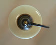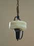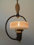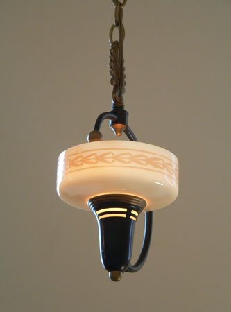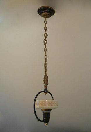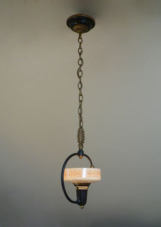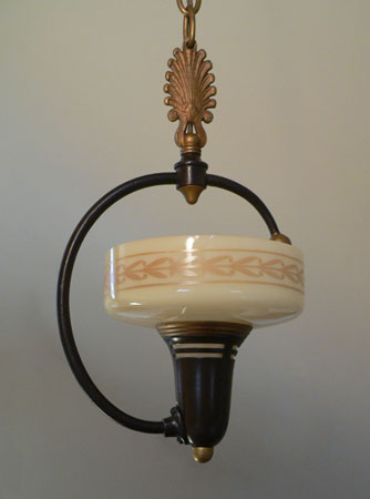 Chandelier C250This antique pendant chandelier was made by Lightolier. The single shade is custard colored glass with a stenciled pattern of leaves encircling the perimeter. The metal fixture has a brown and gold patina. The design is asymmetrical, with the light held at the bottom of a curve that ends in a golden ball. It has been rewired and is in good condition.