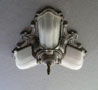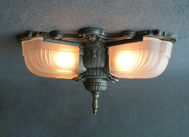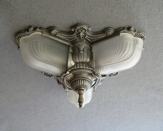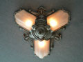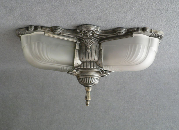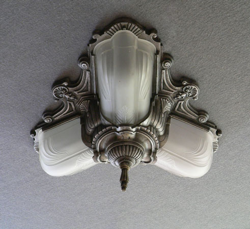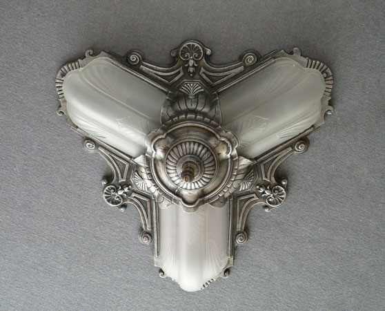 Chandelier C253*Not Available* This is an elegant antique flush mount chandelier from the 1920s. It has three elongated, frosted white glass shades. The metal has wonderful sculpted designs, and a silver colored patina. It is rewired and ready for installation.