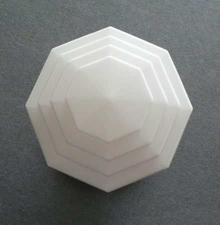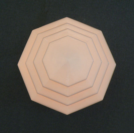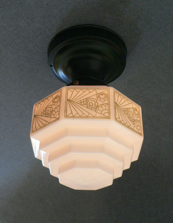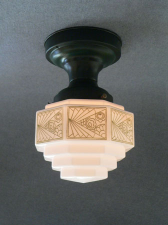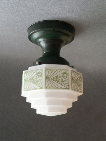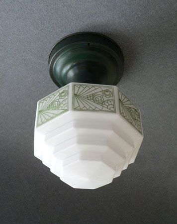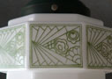 Chandelier C259*Not Available* This is a lovely Art Deco flush mount chandelier with a "skyscraper" style shade. The octagonal shade is white with a stylized "fan and floral" design stenciled in green. The refubished metal fixture has a dark green patina to compliment the design on the glass. Both the glass and fixture are in very good condition. Perfect for a smaller space.