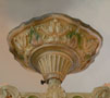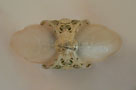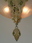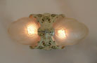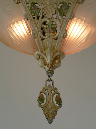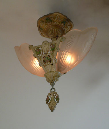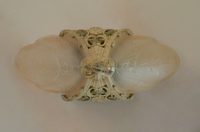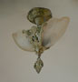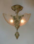 Chandelier C267*Not Available* This flush mount Art Deco chandelier was made by Markel in the 1920's. The two amber shades have a decorative floral pattern molded into the glass. The metal fixture has fanciful floral motifs. The original patina is cream colored with has gold, pink, and green accents. Both the glass shades and patina are in very good condition. H: 16" |