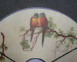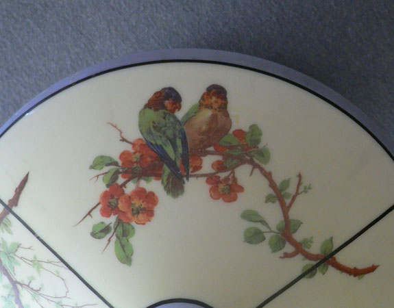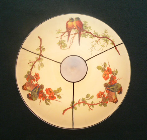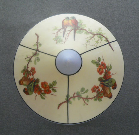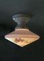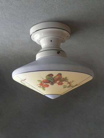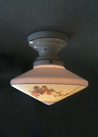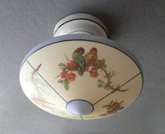 Chandelier C270*Not Available* This charming flush mount chandelier from the Art Deco period was made by Lightolier. The light cream colored glass shade has three sections decorated with pairs of Love Birds sitting on flowering branches. The upper part of the shade, as well as the bottom center, are powder blue. Black lines delineate the different areas. The white ceramic fixture has black lines that complement the glass. H: 11" (fixed mount) |