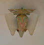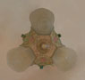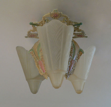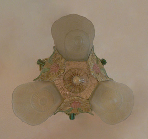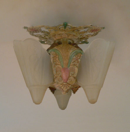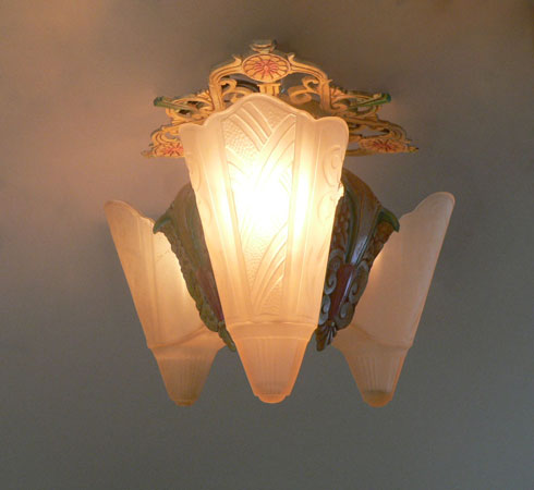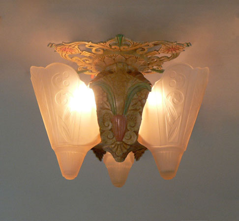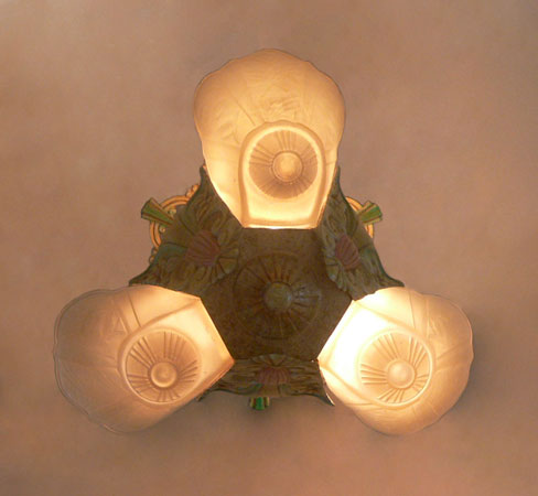 Chandelier C275This Art Deco flush mount chandelier was made by Lincoln. Three large, amber slip shades have geometric designs. The ornate metal fixture is covered with floral elements. The patina is a dark cream color with accents of pink and green. H: 10" (flush mount) |
