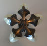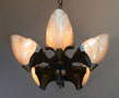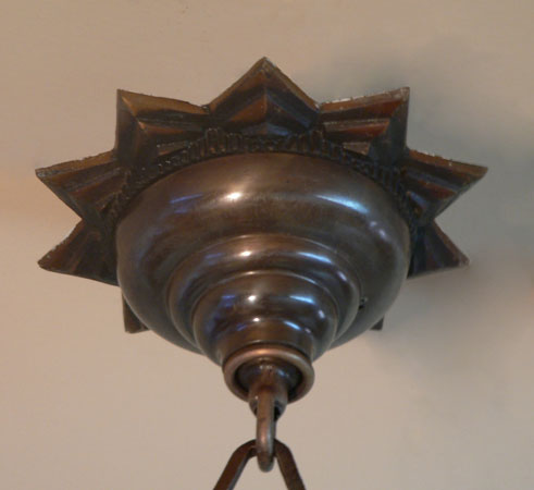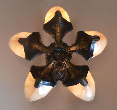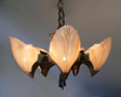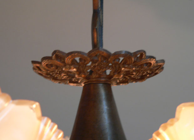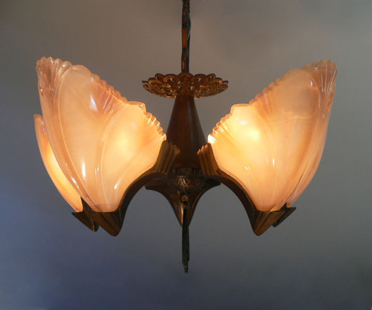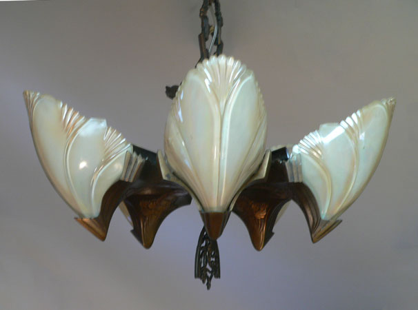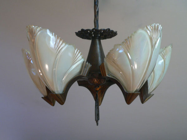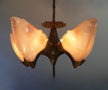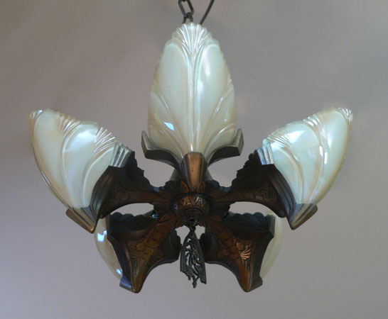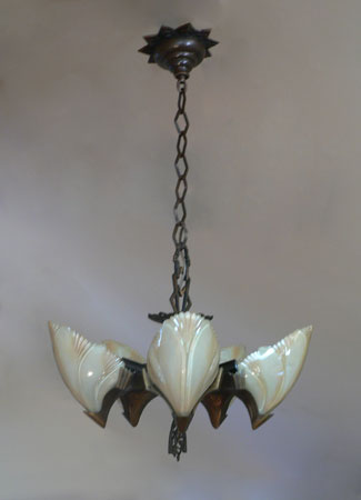 Chandelier C276*Not Available* This Art Deco chandelier by Midwest Manufacturing has five, opalescent "batwing" shades with orange-brown accents. The metal is cast bronze with beautifully worked floral details on the fixture, and pendant. The patina is in perfect condition. Scroll down for the last picture. To see the matching three light chandelier H: 32" (adjustable chain) |