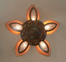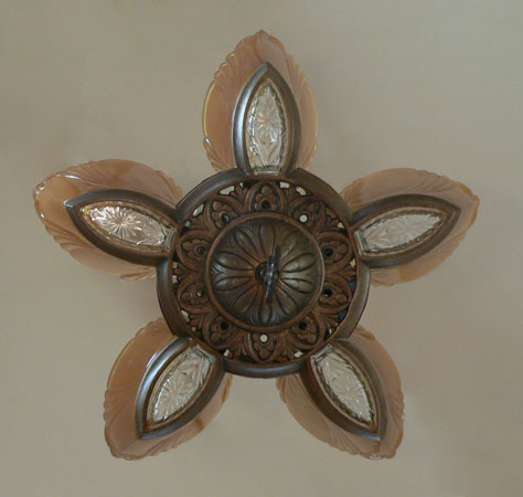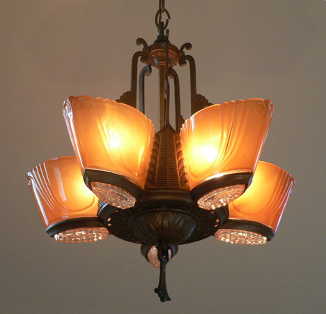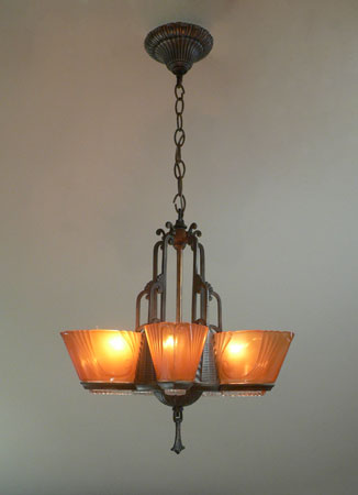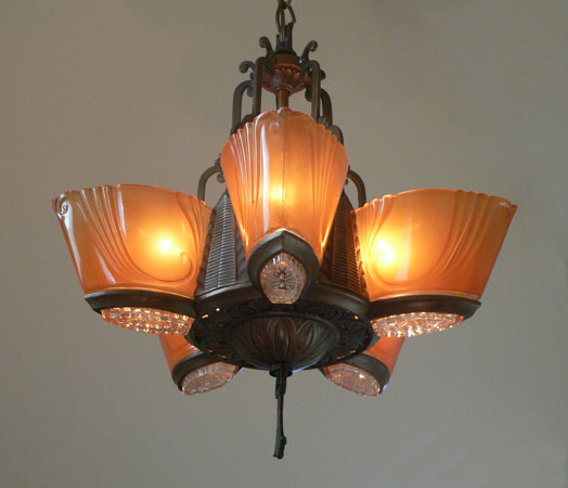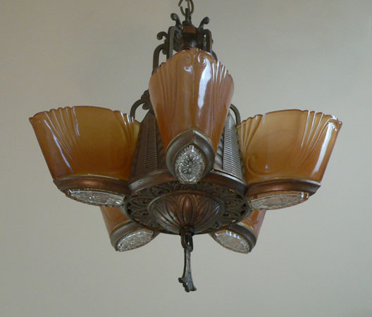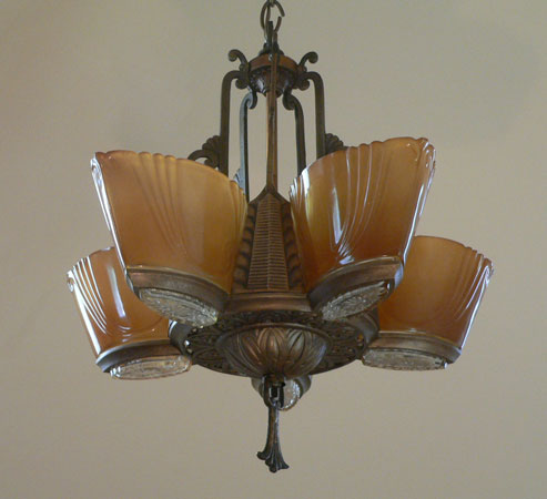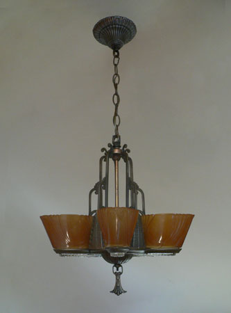 Chandelier C280This stunning Art Deco chandelier was made circa 1925. It has five original, deep amber glass, slip shades with clear glass bottoms. The metal work has its original bronze colored patina. Both the metalwork and the glass slip shades are in very good condition. Click to see matching sconces here (S-2) and the three light chandelier here (C-119) H: 30" (adjustable chain) |