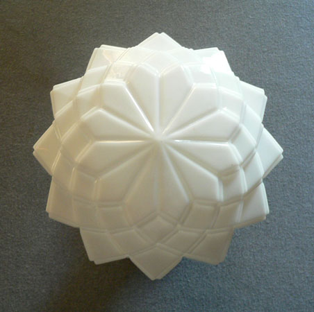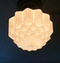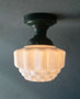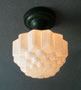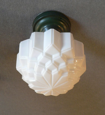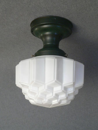 Chandelier C282*Not Available* This is a lovely Art Deco chandelier with a single white, milk glass shade in the classic skyscraper style. The metal fixture has a dark green patina. Both the glass and metal are in very good condition. H: 10" (fixed mount) |