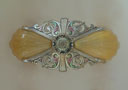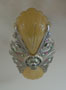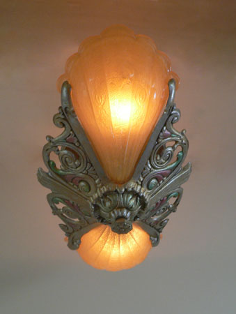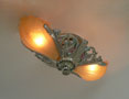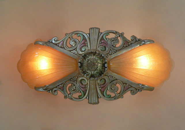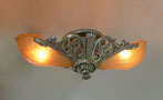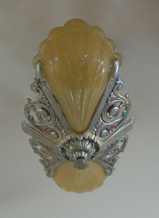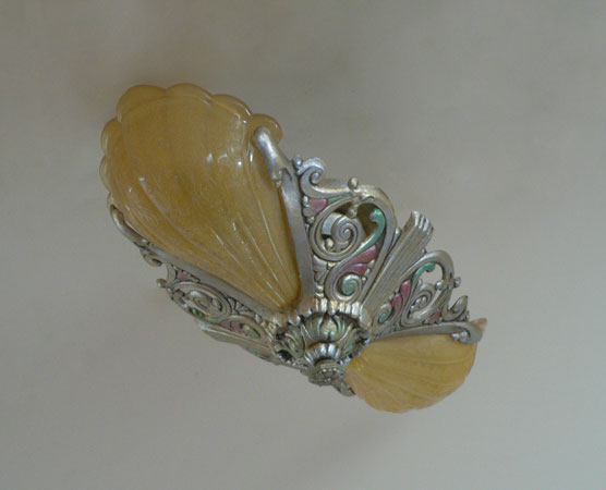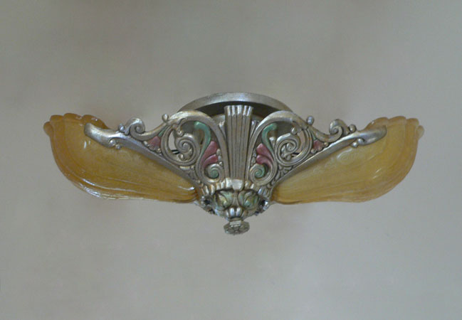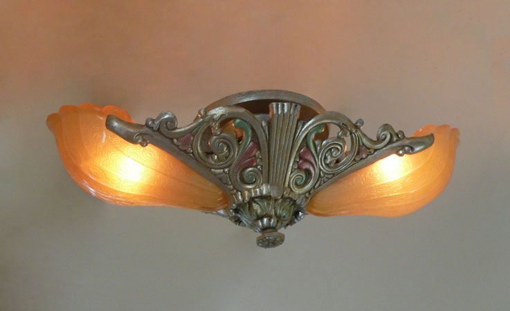 Chandelier C283*Not Available* This Art Deco chandelier was made by the Riddle company in the 1920s. The two amber colored glass shades have a beautiful, shell-shape form. A finely ridged pattern on the interior of each shade increases visual interest. The fixture is a silver colored metal with a delicate polychrome patina. H: 6" (fixed mount) |