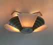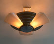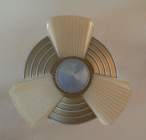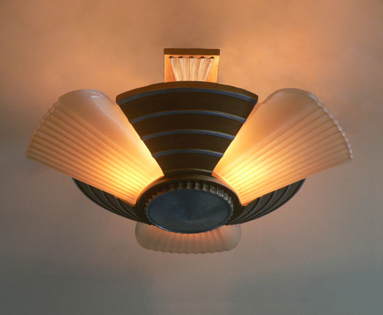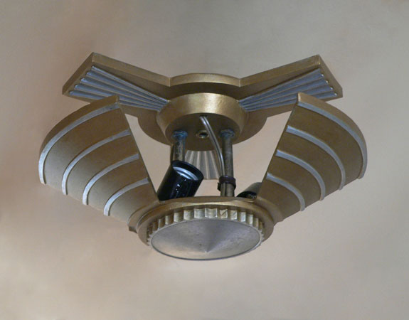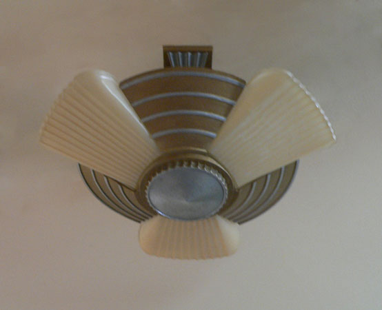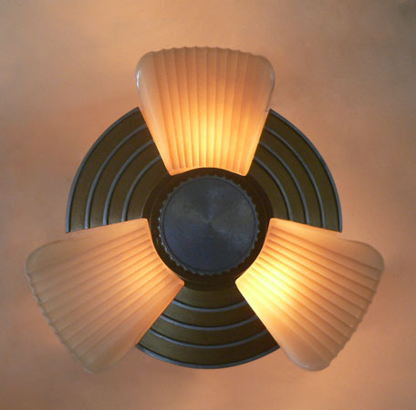 Chandelier C290*Not Available* This beautiful antique Art Deco chandelier has three lights held in a classic "Machine Age" fixture. The amber colored glass shades have vertical fluting that contrasts nicely with the horizontal linear designs of the metal. The refurbished fixture has a golden colored patina with silver accents and bottom, as well as updated wiring and sockets. H: 6" (fixed mount) |