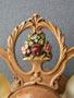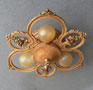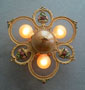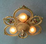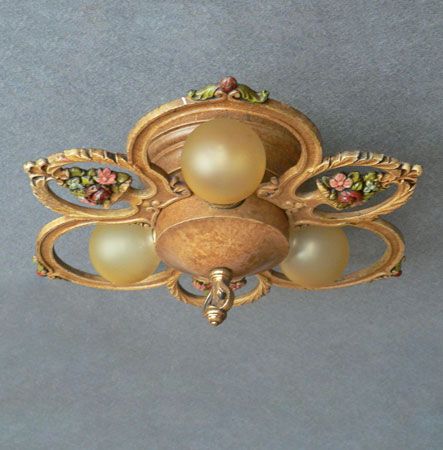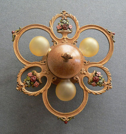 Chandelier C294*Not Available* This Victorian/Art Deco flush mount chandelier holds three bulbs in delicate rings with beautiful flower arrangements between them. The fixture has the original stippled yellow ochre patina. The floral details are lovely and accented by green, red, pink, and light blue. (Please note: Amber bulbs are not included) H: " (flush mount) |