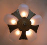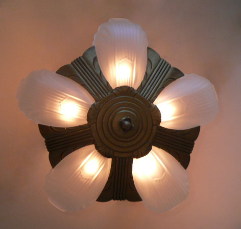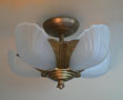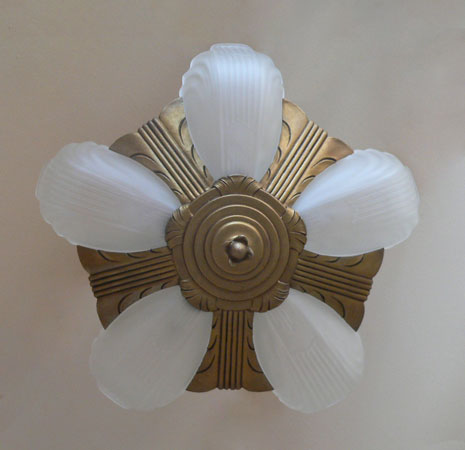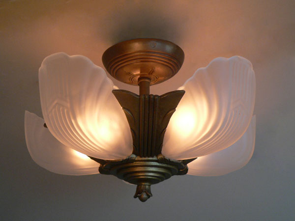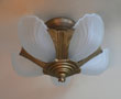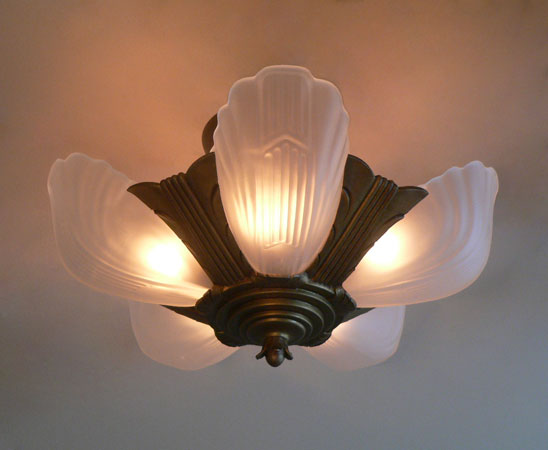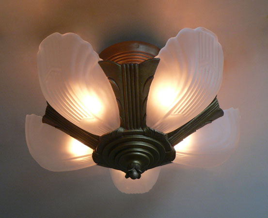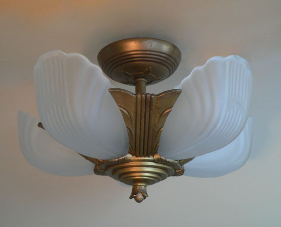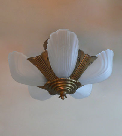 Chandelier C295*Not Available* This is an Art Deco flush mount chandelier made by Markel. The five glass slip shades are made of frosted white glass. A chevron simple design appears on each with delicate fluting on either side. The metal fixture has a golden brass patina in very good condition. H: 11" (flush mount) |