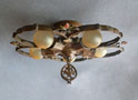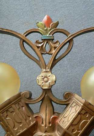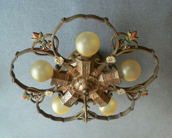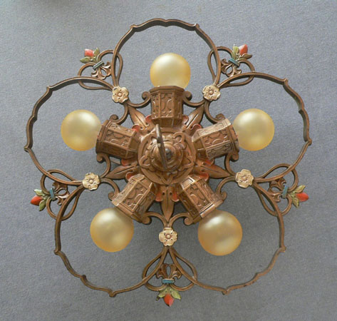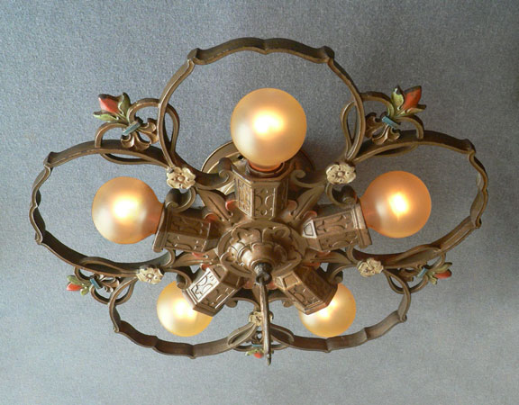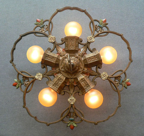 This chandelier is from the Victorian/ Art Deco period. Five bulbs are held in decoratively formed rings. A floral vignette appears between each of the rings. The central portion has geometric designs. The polychrome patina is original and in very good condition. The fixture is a golden color with accents of red, green, blue and white on the floral designs. (bulbs are not included)