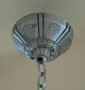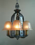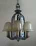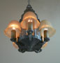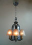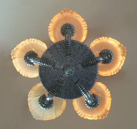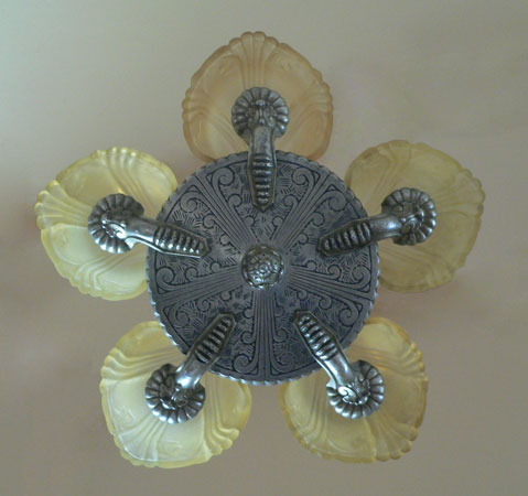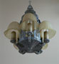 Chandelier C299This antique Art Deco chandelier was made by Virden. The five, amber glass shades cover candle-like lights. The glass is beautifully molded in delicate organic forms. The silver colored metal has finely pierced Deco designs. H: 33" (adjustible chain) |