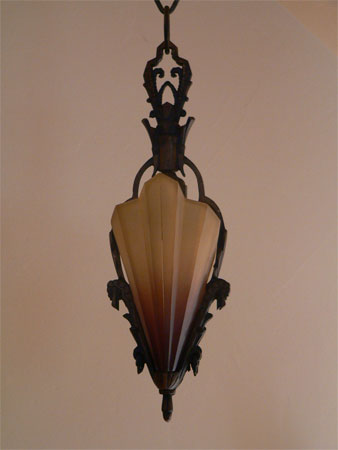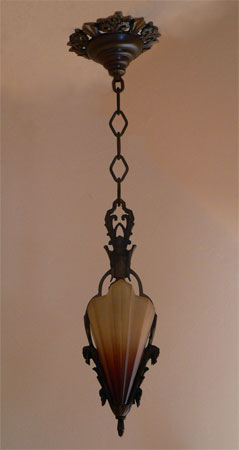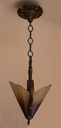 Chandelier C3Another in the rare Art Deco Soleure Series by the Midwest Manufacturing Co. This is a delicate light with only two of the brown tip slip shades. The metal work is cast bronze with original patina in perfect condition. H: 22" (adjustable chain) |