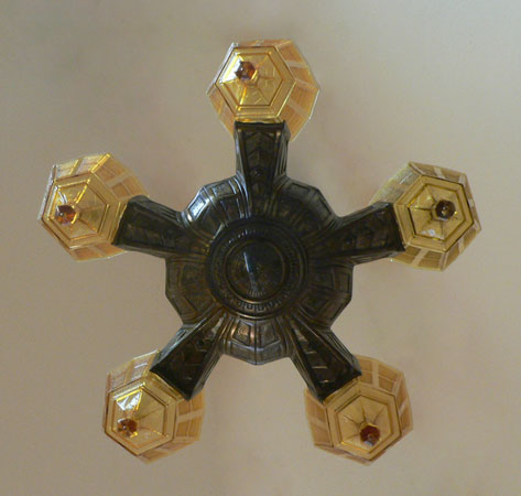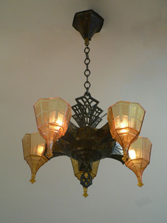 Chandelier C304This is a rare Art Deco chandelier by Frankelite. The five amber colored glass shades have beautiful elongated bases with a geometric pattern of clear and frosted areas. The pattern is repeated in both the body and harp of the bronze colored metal fixture. H: 30" (adjustable chain) |
