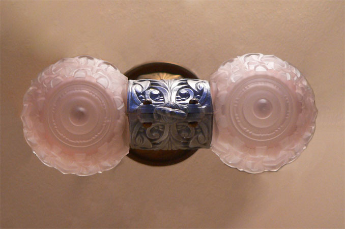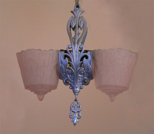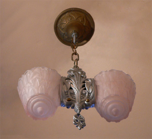 Chandelier C33*Not Available* This sweet Art Deco chandelier from the Meletio "Nile Group" was manufactured by Lincoln. The ornate aluminum fixture and glass are meant to evoke the papyrus and lotus found along the Nile. The two glass slip shades are in "orchid" pink. The patina is silver colored and in good condition. (adjustable chain) |