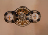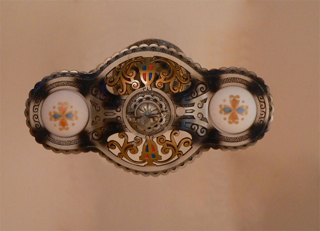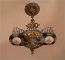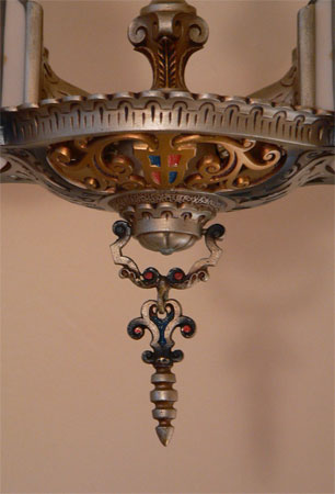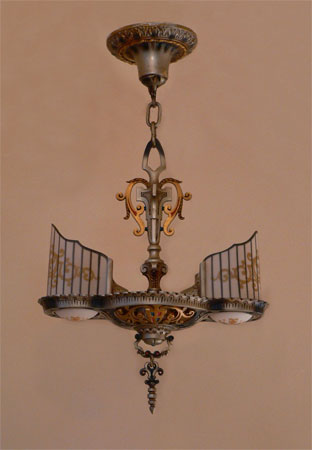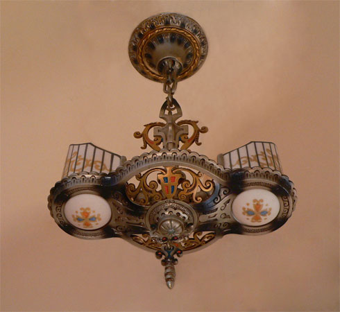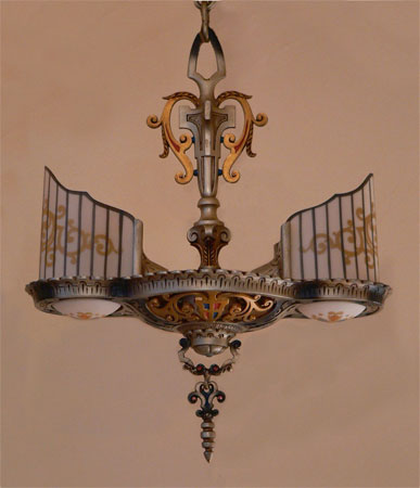Chandelier C34*Not Available* This Art Deco design by Beardslee features two cream colored glass slip shades, painted with heraldic designs. The fancifully designed aluminum fixture has gold, red, blue, and black accents. The patina is in excellent condition. Be sure to scroll down for all the pictures. (adjustable chain) |
