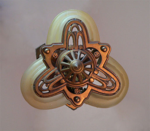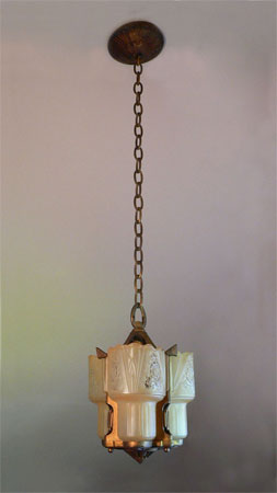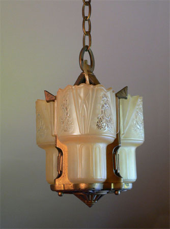 Chandelier C35*Not Available* This is a lovely chandelier by the Lightolier Co. It has three translucent amber glass slip shades with transparent flower designs. The fixture is cast iron with a perfect, original, gold patina. (adjustable chain)(adjustable chain) |