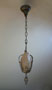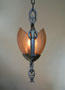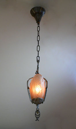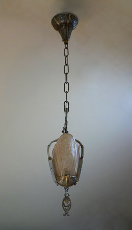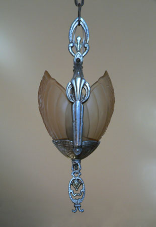 Chandelier C42*Not Available* This Art Deco chandelier by the Lincoln Co. has two amber glass slip shades with floral designs. The fixture is cast aluminum with the original patina in perfect condition. H: 27"(adjustable chain) |