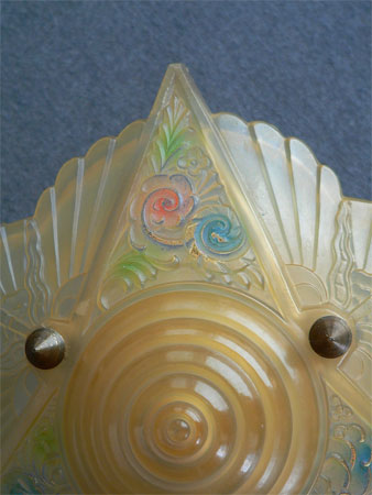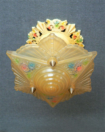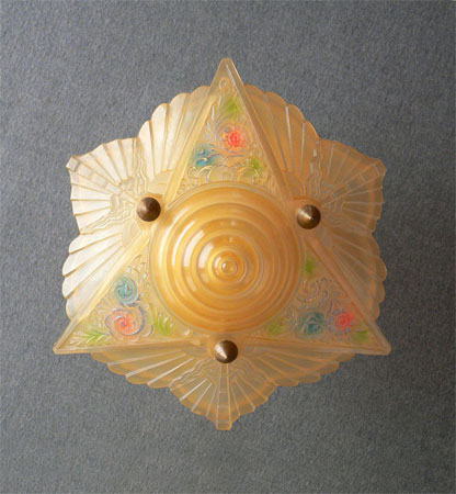 Chandelier C52This is a sweet Art Deco flush mount chandelier with a beautiful amber glass shade, decorated with floral and fan designs. Both the shade and the canopy have pink, blue and green accents. The canopy is aluminum. Bronze arms and bolts hold the shade in place. Probably made by Midwest Manufacturing based on the design of the canopy. (flush mount) |