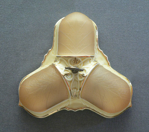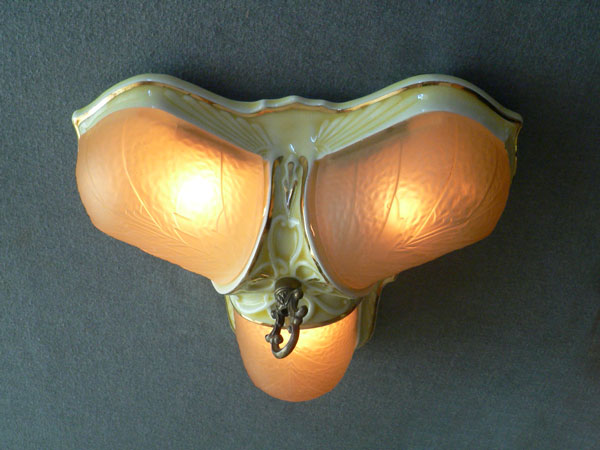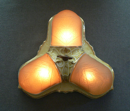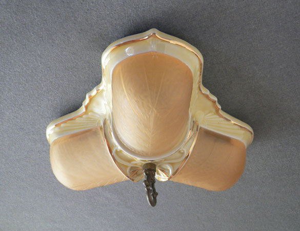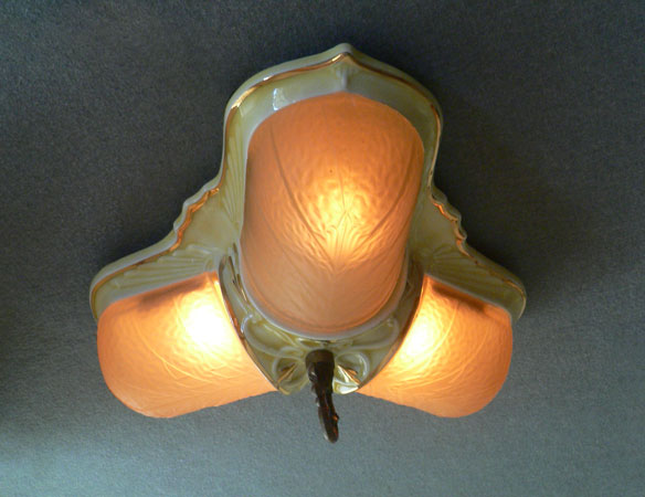 Chandelier C63This charming flush mount Art Deco "porcelier" chandelier was made circa 1930. It has three original, amber glass, slip shades. The fixture is cream-colored porcelain with bright gold accents. Both the glass shades and the porcelain fixture are in great shape. H: 7"(flush mount) |