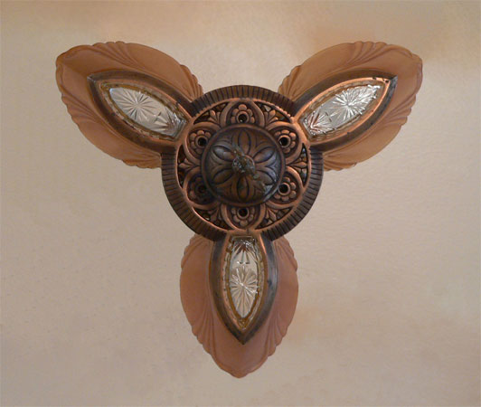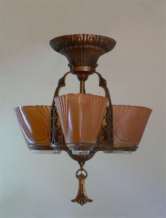 Chandelier C65*Not Available* This charming flush mount Art Deco chandelier was made circa 1925. It has three original, deep amber glass, slip shades with clear glass bottoms. The metal work has its original bronze colored patina. Both the metalwork and the glass slip shades are in good condition. Click to see matching chandelier (C-119) and sconces (S-2) H: 13"(flush mount) |