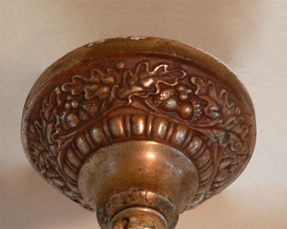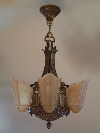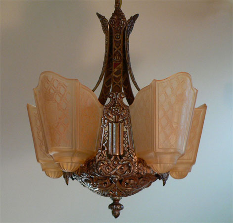 Chandelier C72*Not Available* This Art Deco Chandelier by the Moe Bridges Co. has five regal, amber glass, slip shades, decorated with coats of arms. The cast iron fixture is decorated with oak leaves and acorns. The patina is an aged gold color and in good condition. H: 25"(adjustible chain) |