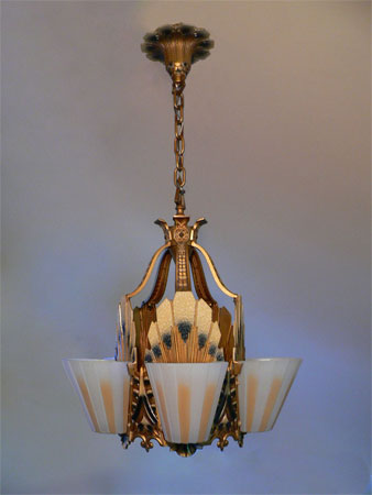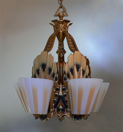 Chandelier C73*Not Available* This stunning Art Deco Chandelier was made by the Beardslee Williamson Company of Chicago in the 1920's. The five, frosted glass, slip shades are sculpted and tinted to match the beautiful sunburst motif of the fixture. The polychrome patina on the metal has blackened accents that off set the design. Both the glass and patina of this classic Art Deco piece are in perfect condition. Click here to see the matching sconces (S72) H: 36"(adjustible chain) |