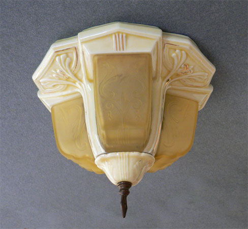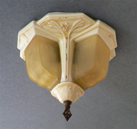 Chandelier C78*Not Available* This charming flush mount Art Deco "porcelier" chandelier was made circa 1930. It has three original, yellow glass, slip shades. The fixture is cream-colored porcelain with bright gold accents. The glass shades are in good condition with a couple of flea bites. The porcelain is in good condition with a little wear on some of the gold around the edges. H: 8"(flush mount) |