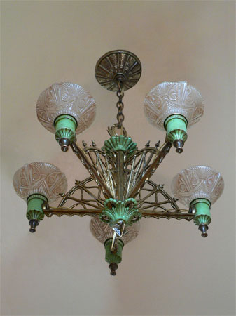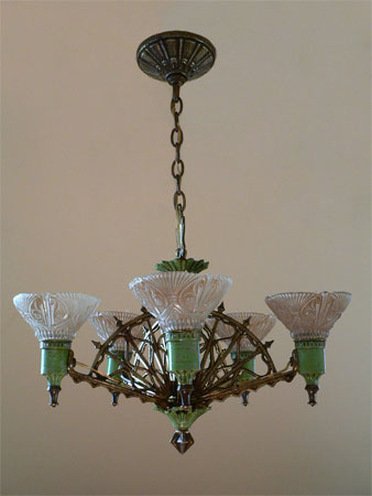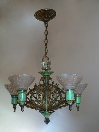 Chandelier C82*Not Available* This distinctive Art Deco design, by Lightolier, has five deeply incised, frosted glass shades. The abstracted sheath forms are enhanced by a baked on enamel in the crevices. The individual lights are suspended on a "wagon wheel" type lattice. The metal is brass, with green enamel. Both the glass shades and brass fixture are in very good condition. H: 26"(adjustable chain) |