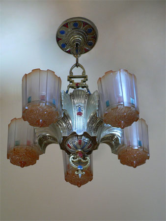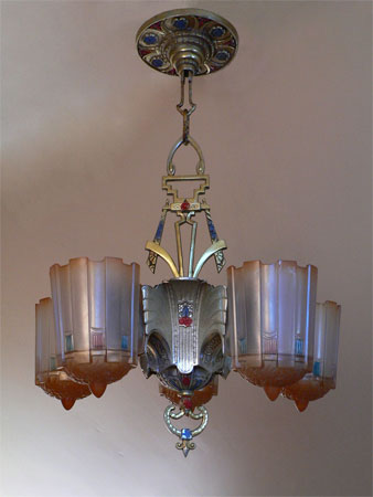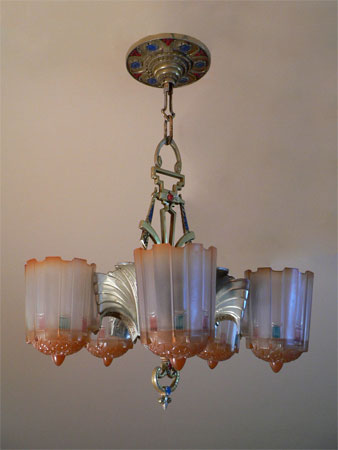 This is an original Art Deco chandelier by Markel. The stately design features five glass slip shades, remeniscent of castle turrets. Each of the frosted white shades has dark amber tinting at its sculpted floral base, as well as a hint along the top edge. They also have red and blue/green accents around the sides. The silver metal fixture has sweeping lines and its original polychrome with blue and red enamel. The shades and fixture are in excellent condition.(see the matching sconces S-85)
