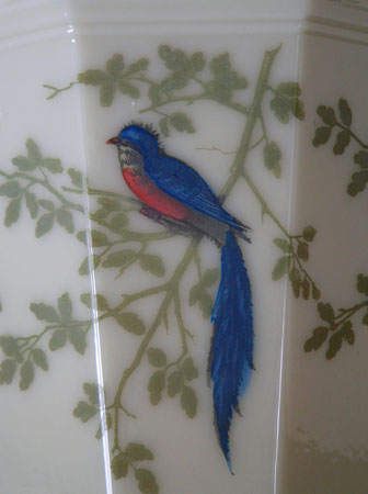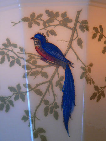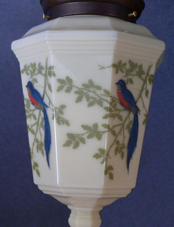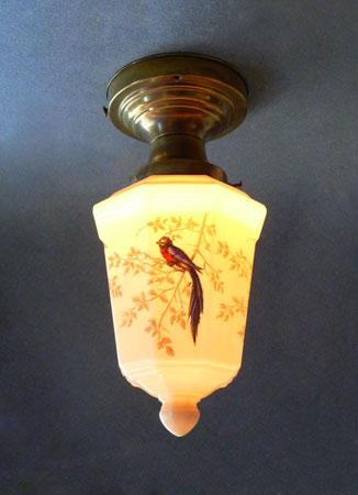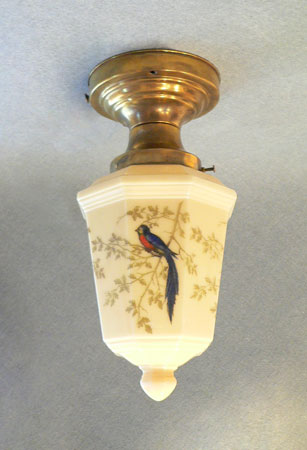 This beautiful Art Deco ceiling light features four beautiful blue birds, perched in delicate branches, around its octagonal shade. The color elements on the birds appear to be hand painted over a stencil. H: 15"(flush mount) |