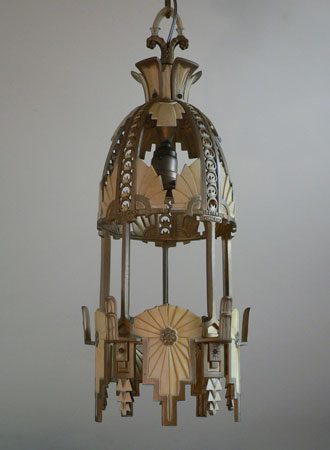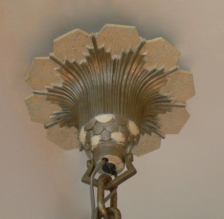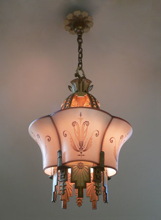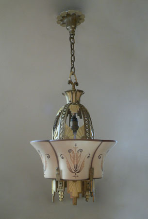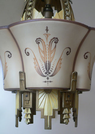 Chandelier C89This exquisite example of Art Deco lighting was made by the Beardslee Williamson Company of Chicago. This is a very rare piece of unusual design. One large translucent shade cleverly slips into place over the wonderful metal fixture. The metal work is pure Deco with sunburst forms and geometric accents. The shade is cream colored and painted with graceful strokes. The fixture is in very good condition, and the shade is also in good condition. H: 36"(adjustable chain) |