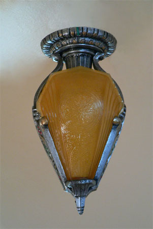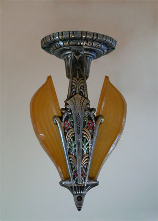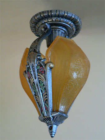 Chandelier C91*Not Available* This lovely Art Deco ceiling light was made by the Riddle Co. The two amber glass shades are in perfect condition. The aluminum fixture has stylized floral features and a polychrome finish. It is the perfect size for a hallway or entryway. H: 11.5"(flush mount) |