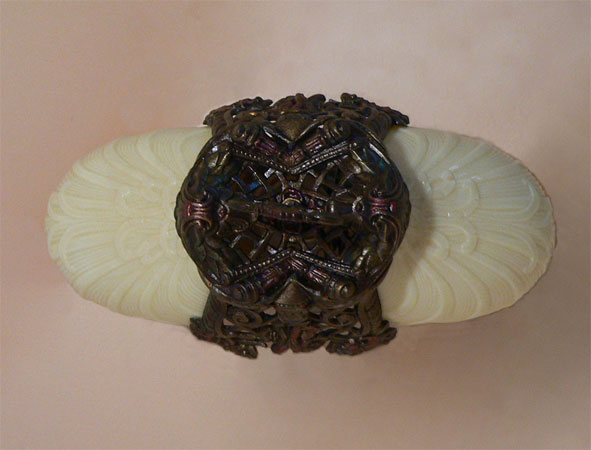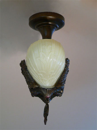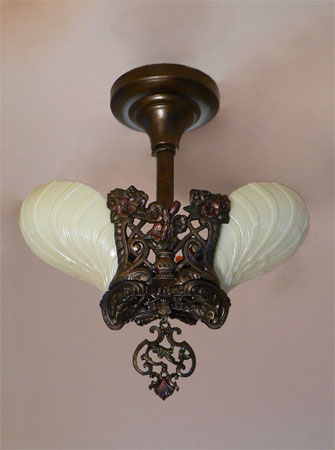 Chandelier C93This is a lovely little Art Deco chandelier by Midwest Lighting. The light cream, colored glass, slip shades have a very organic shape with stylized designs formed into the surface. The bronze colored fixture has detailed floral designs. The patina has been refurbished with a delicate polychrome. H: 30"(adjustable chain) |