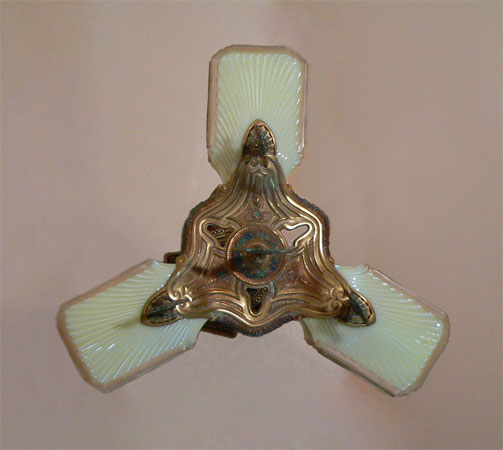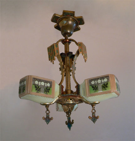 Chandelier C98This beautiful and rare Art Deco design was made by Gill Glass in the 1920's. This particular fixture was boxed and stored since the 1940's (wrapped in newspapers from WW II!) The three box shaped slip shades are cream colored with painted floral designs on the sides. The fanciful fixture is bronze. Pendants hang below each glass shade, holding it in place. Both the shades and fixture are in very good condition. See the matching chandeliers and sconces (C-29, C-84, C-100, C-106 & S-9) H: "(adjustable chain) |