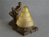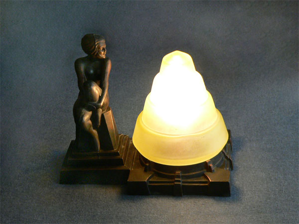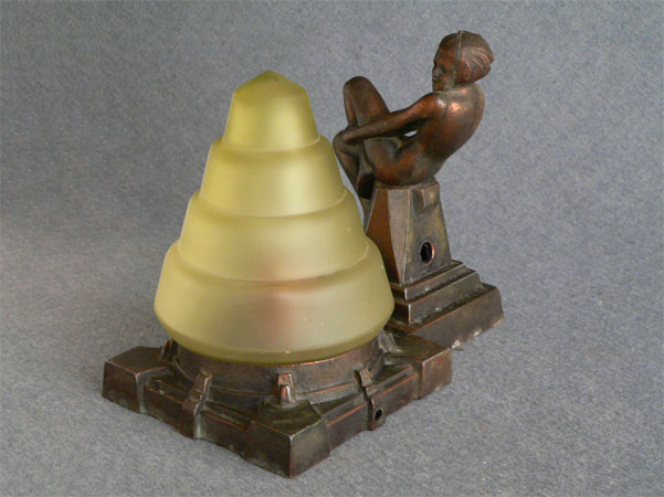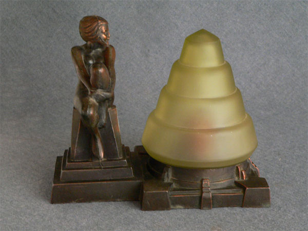 Lamp L10This lovely little Art Deco lamp from the Frankart period has a female figure enjoying the glow from the light green glass shade. Her playful posture adds to the charm of the piece. The metal is bronze. H: 7" |