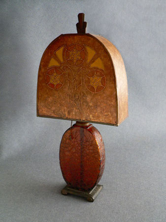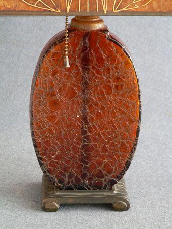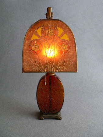 Lamp L11*Not Available* This very lovely accent lamp is early Arts and Crafts/ Mission style (early 1900's). The high quality mica shade has stylized flowers on both sides, done with a raised enamel outline with tinted areas in yellow and deep orange. The base is deeply crackled amber glass. Everything is original. H: 20.5" |