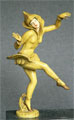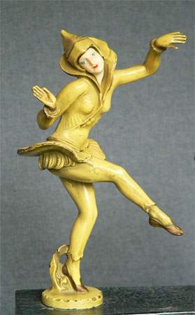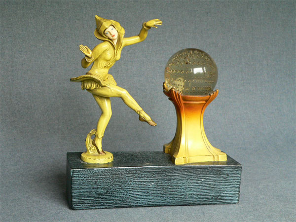 Lamp L2This 1930's Art Deco lamp has a "Pixie Dancer" in Harlequin constume. Her face is carved from an ivory-like material. The figure's patina is yellow. The blown glass crystal ball has tiny bubbles in a spiral pattern. The base is metal with a black/grey patina. H: 10" |