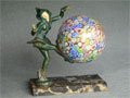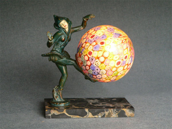 Lamp L4*SOLD* This beautiful Art Deco lamp has a "Pixie Dancer" in Harlequin costume, balancing a Millefiori glass "ball" shade on her foot. The dancer's face is carved from an ivory-like material. Her patina is dark blue/green. The base of the lamp is black marble. H: 8" |
