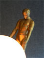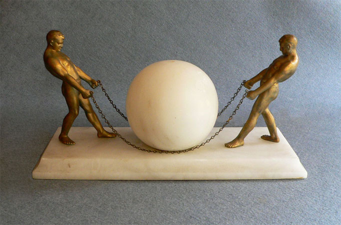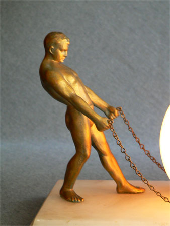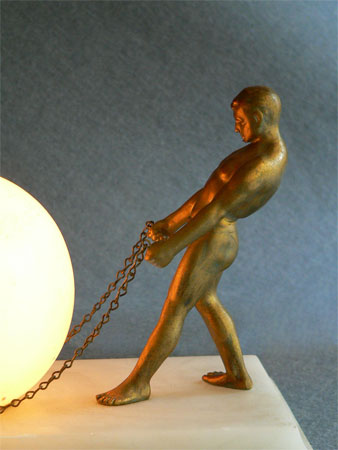 Lamp L9This beautiful Art Deco lamp features two beautifully sculpted male figures striking poses of strength. A glowing orb is held steady by the chains in their grip. The bronze figures are very naturalistic in both physique and pose. The orb and the base are both white marble. H: 7" |
