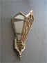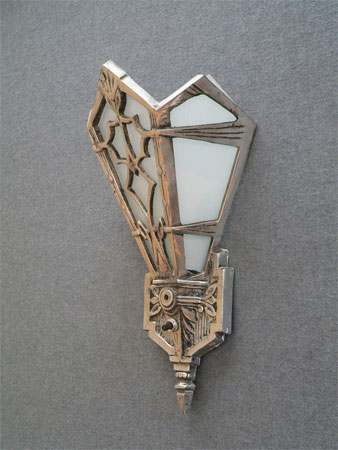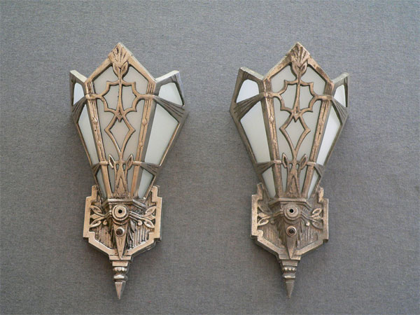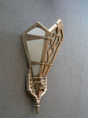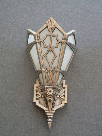 Sconce S10*Not Available* These large Art Deco sconces were probably designed for an old movie house. Each has three, white glass panels that fit into the very stylized, silver colored metal work. H: 14" |