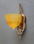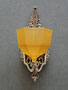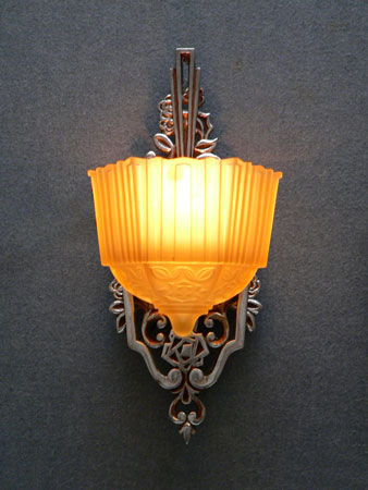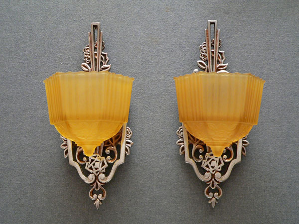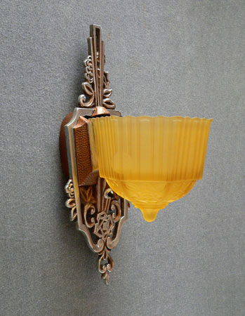 Sconce S100This beautiful pair of Art Deco sconces was made by Markel. The amber glass shades are deeply molded. The elegant backplates have polished aluminum as well as areas with a bronze colored patina. The glass shades are in very good condition. Two pairs of sconces are available. H: 13" |