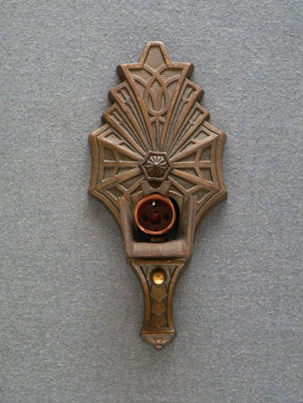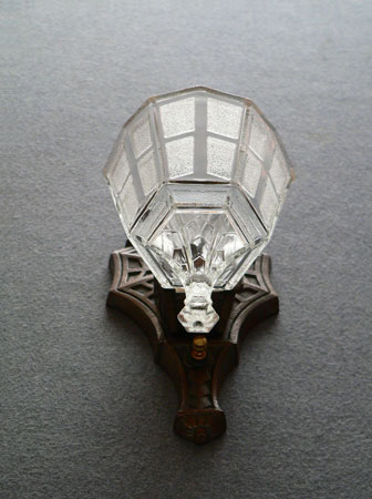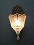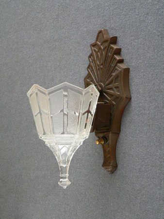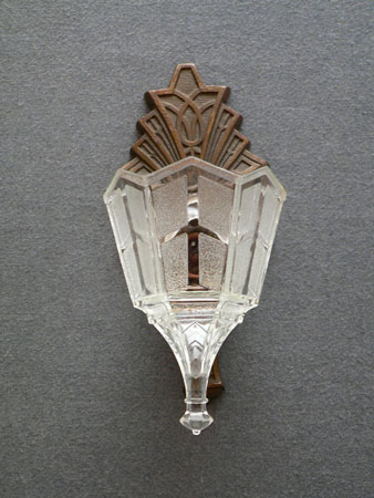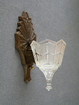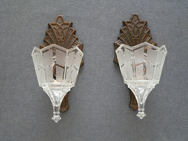 Sconce S107*Not Available* This is a wonderful pair of Art Deco sconces by Frankelite. The clear glass shades have beautiful elongated bases. The finely worked backplates have their original bronze colored patina in excellent condition. H: 9.75" |