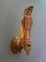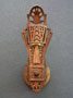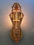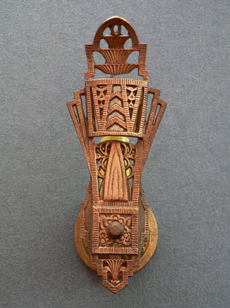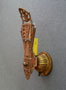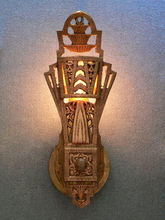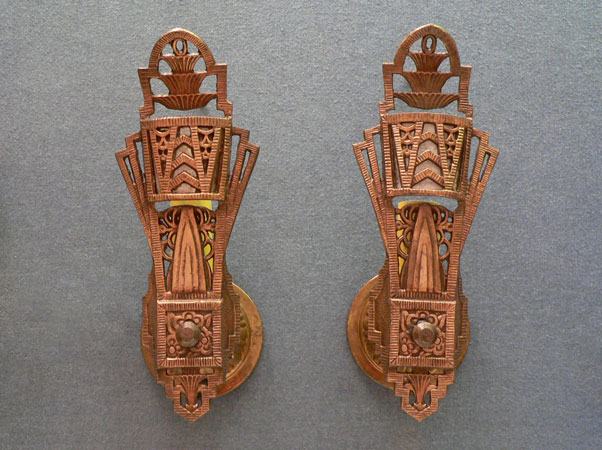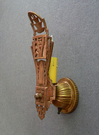 Sconce S109*Not Available* This pair of Art Deco sconces was made in the 1930's. The metal work displays the elegant geometric design and feel of the Spanish Revival movement. The faceplates are bronze with brass backplates. New mica shades have been added to soften the light from the bulb on the candlesicks. Click here to see matching sconces (S-110) and here to see matching chandelier (C-172) H: 11.5" |